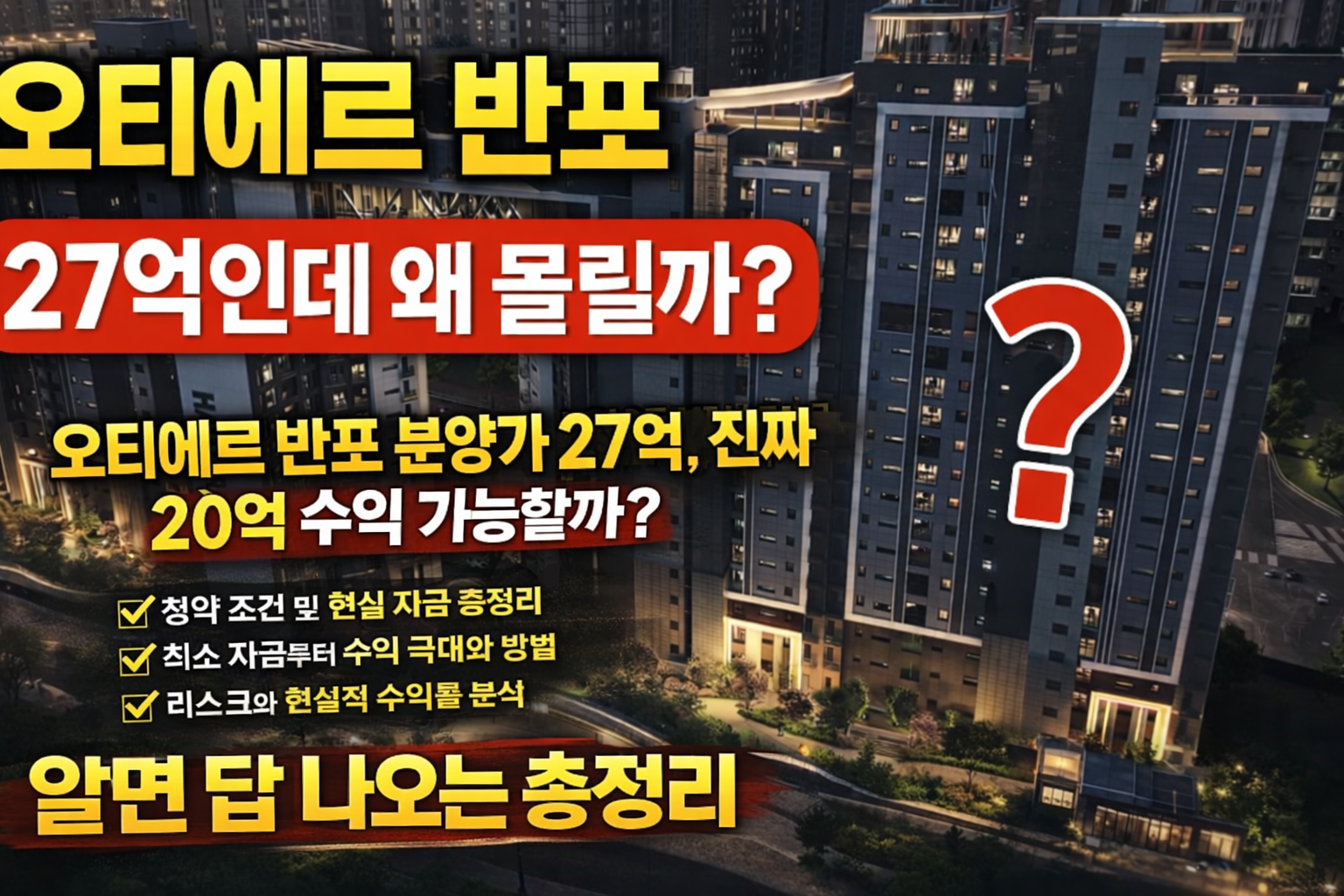 최근 뜨거운 관심을 받고 있는 오티에르 반포 분양가 27억 이슈, 과연 실투자자 입장에서 20억 시세차익이 가능한지 궁금하신 분들이 많습니다. 이번 글에서는 오티에르 반포 청약 조건, 분양가 구조, 그리고 현실적인 자금 계획까지 핵심만 간단히 정리해드립니다.